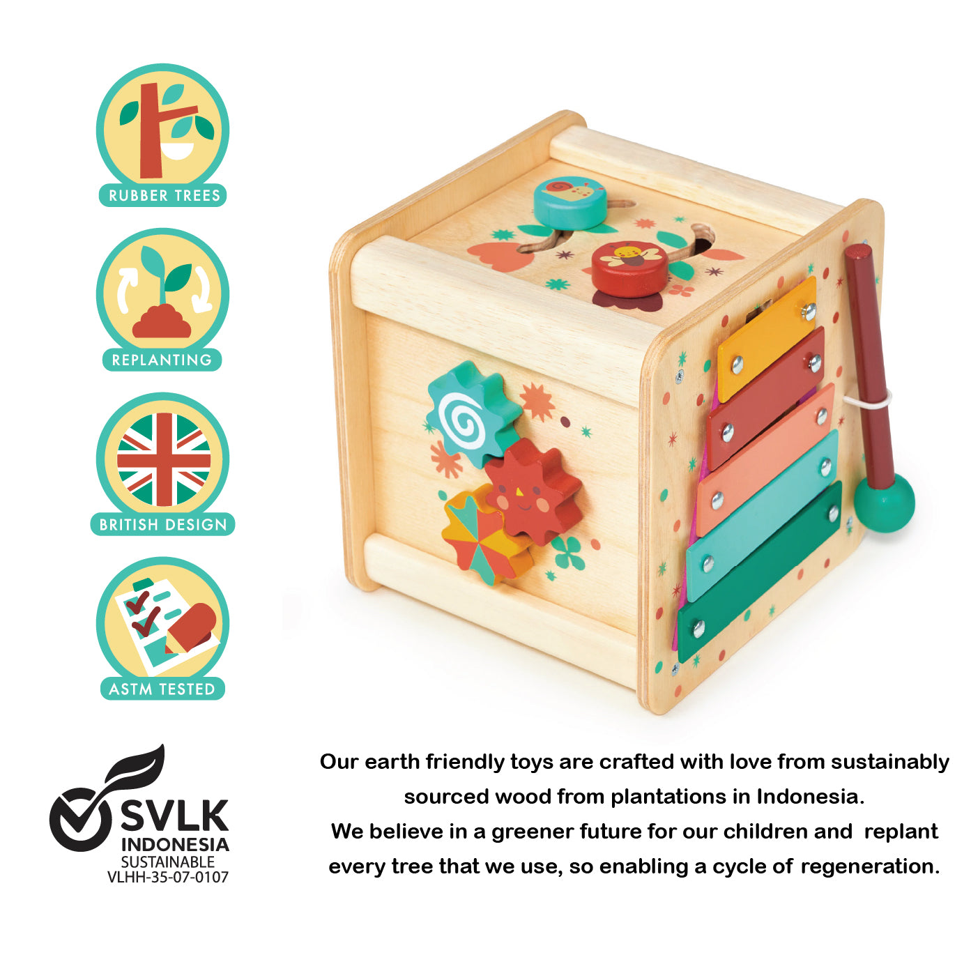 This wooden activity cube offers a variety of ways to play on each of the 6 sides. Learn through play with an assortment of puzzles. A xylophone and stick, cogs and gears, twisting spinning shapes, a door to reveal an illustrated picture, a clock, and 4 small turning panels.