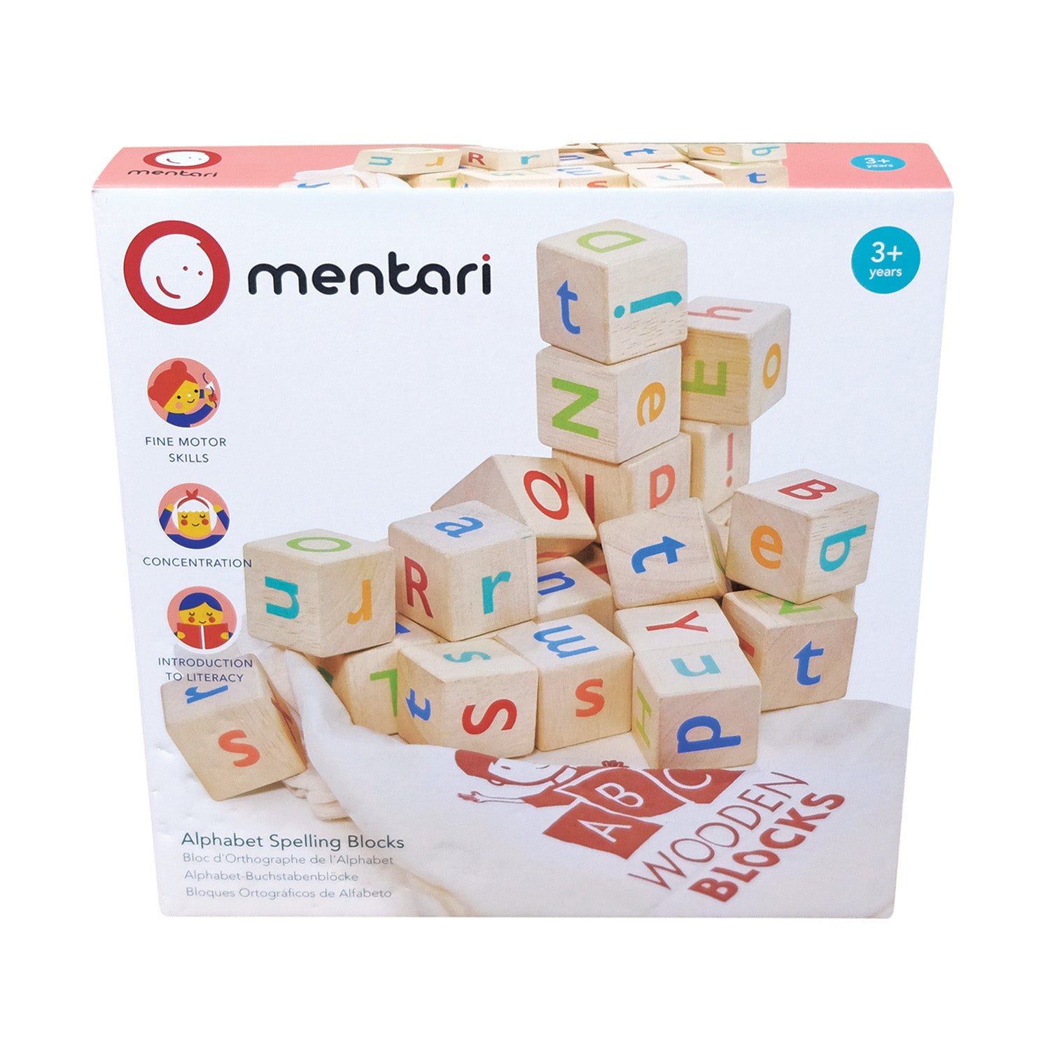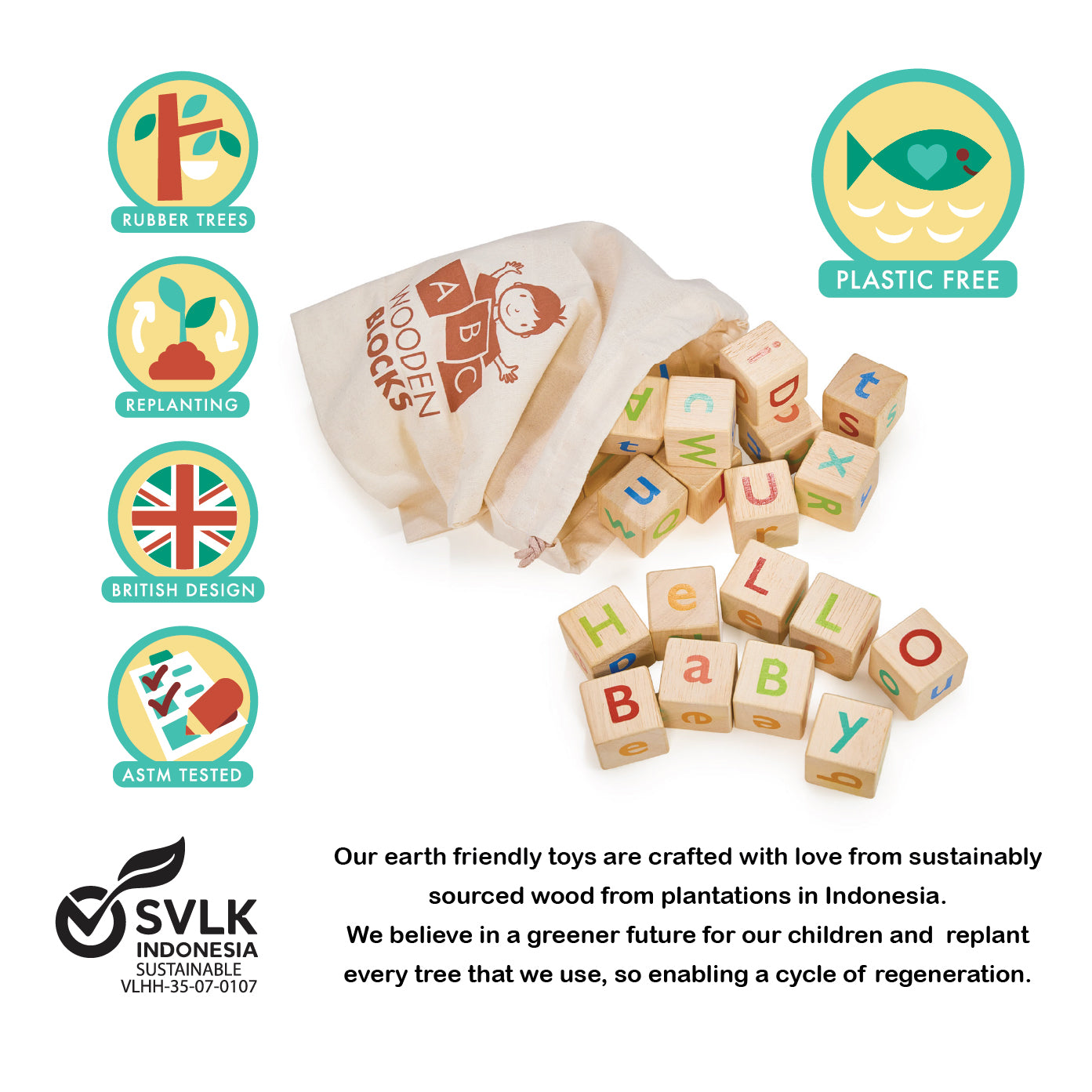 Stacking and spelling toy for children. Learn through play with 26 solid wood blocks decorated on all 6 faces with a colourful letter of the alphabet, presented in a printed drawstring bag. An introduction to spelling basic words, we have included both lower case and upper case letters with a good ratio of vowels to consonants ensure that most words and sentences can be created. A modern and stylish set that encourages a variety of early literacy skills and letter recognition.