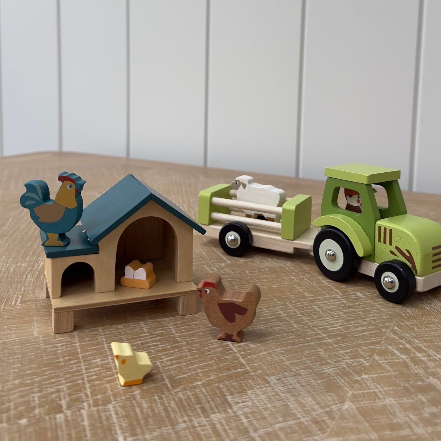 The sweetest little chicken coop, complete with cockerel, hen, chick and eggs. Put the chickens to sleep in the house and find the eggs by lifting the lid on the side.