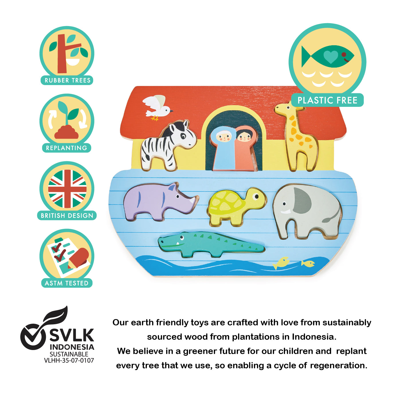 A gorgeous shape-sorting puzzle tray for toddlers. 6 colourful illustrated animals straight from Noah's ark, and Mr and Mrs Noah to sort and place into corresponding shapes on an illustrated Noah's ark tray. Made from sustainably sourced rubber wood and painted in bright non toxic colours.