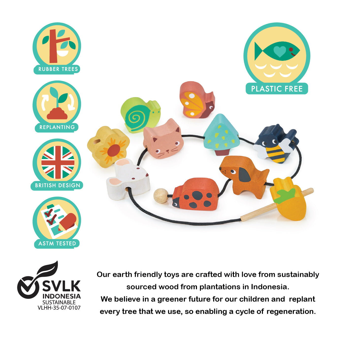 Garden themed large wooden bead shapes with a black cord that has a wooden dowel on the end, to enable easy threading. A ladybird, a dog, a bee, a tree, a cat, a mouse, a carrot, a flower, a snail, and a butterfly. Illustrated with bright colours and cute details.