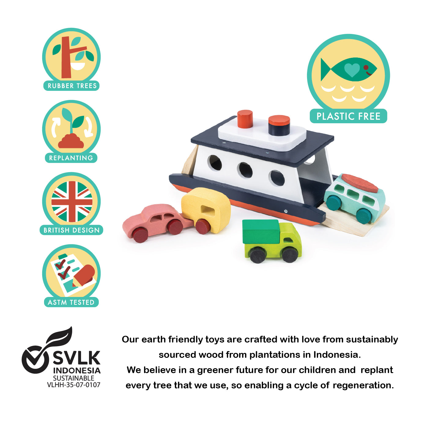 A stylish car ferry with 2 funnels and round windows with loading and unloading both ends. Transport a brightly coloured solid wood car and caravan, a camper van and a truck across the waters. Imaginative play and fine motor skills.