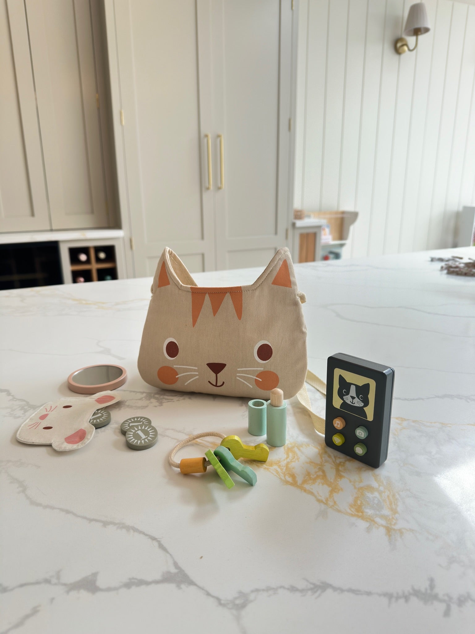 A gorgeous handbag with a kitten face filled with wooden toys suitable for any 3 year old boy or girl!. Just like mummy's handbag, this one has everything you need for a busy outing.
