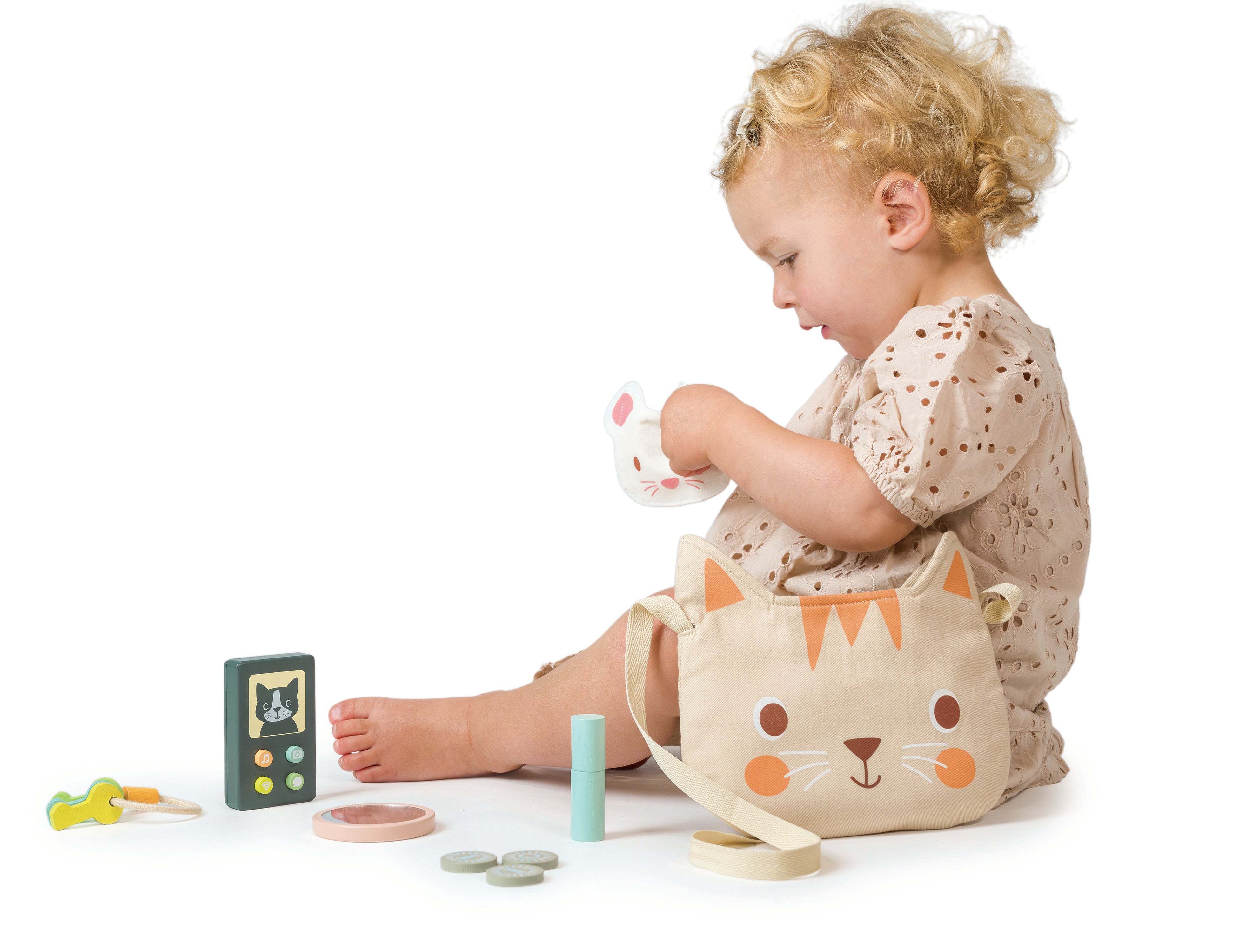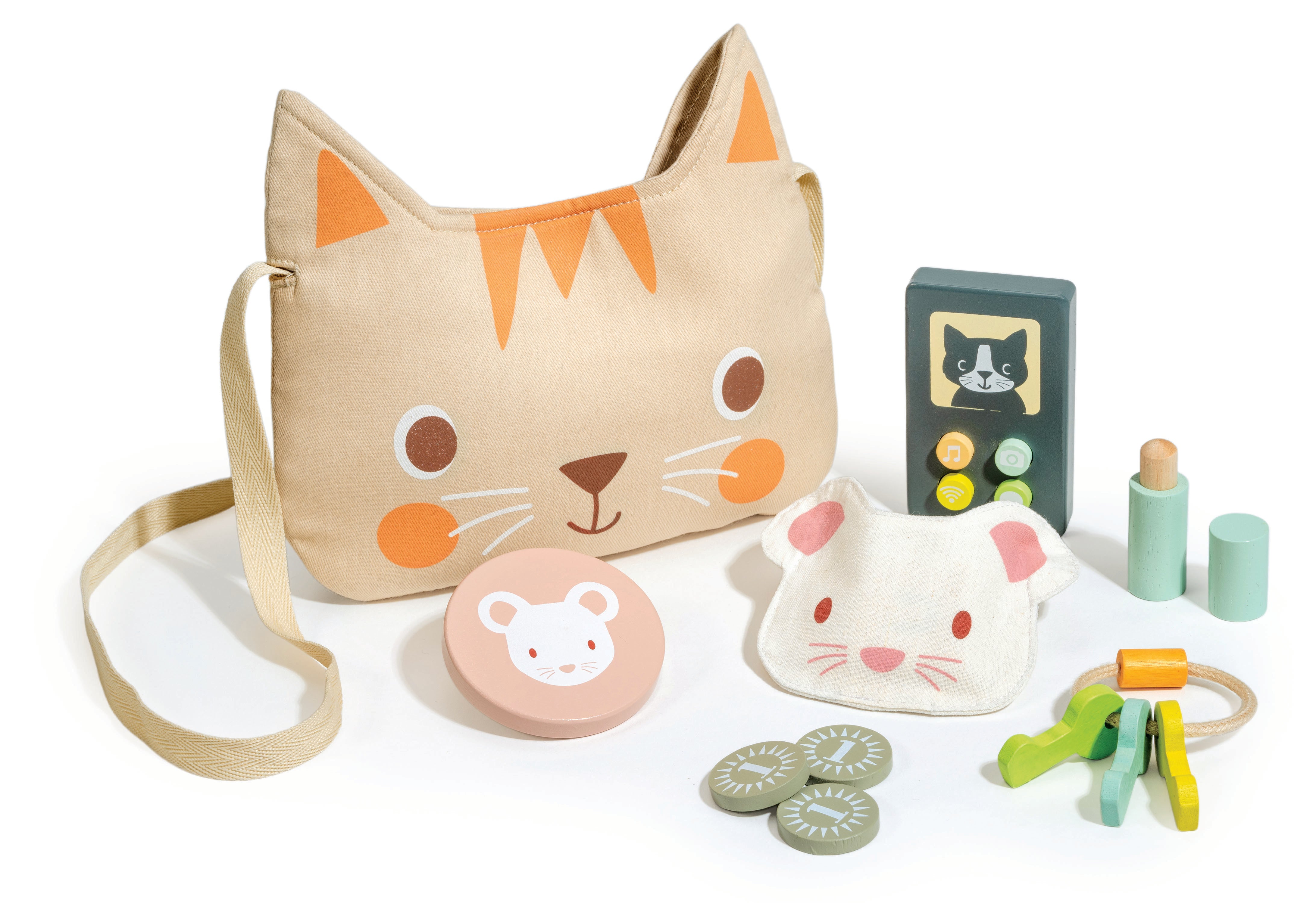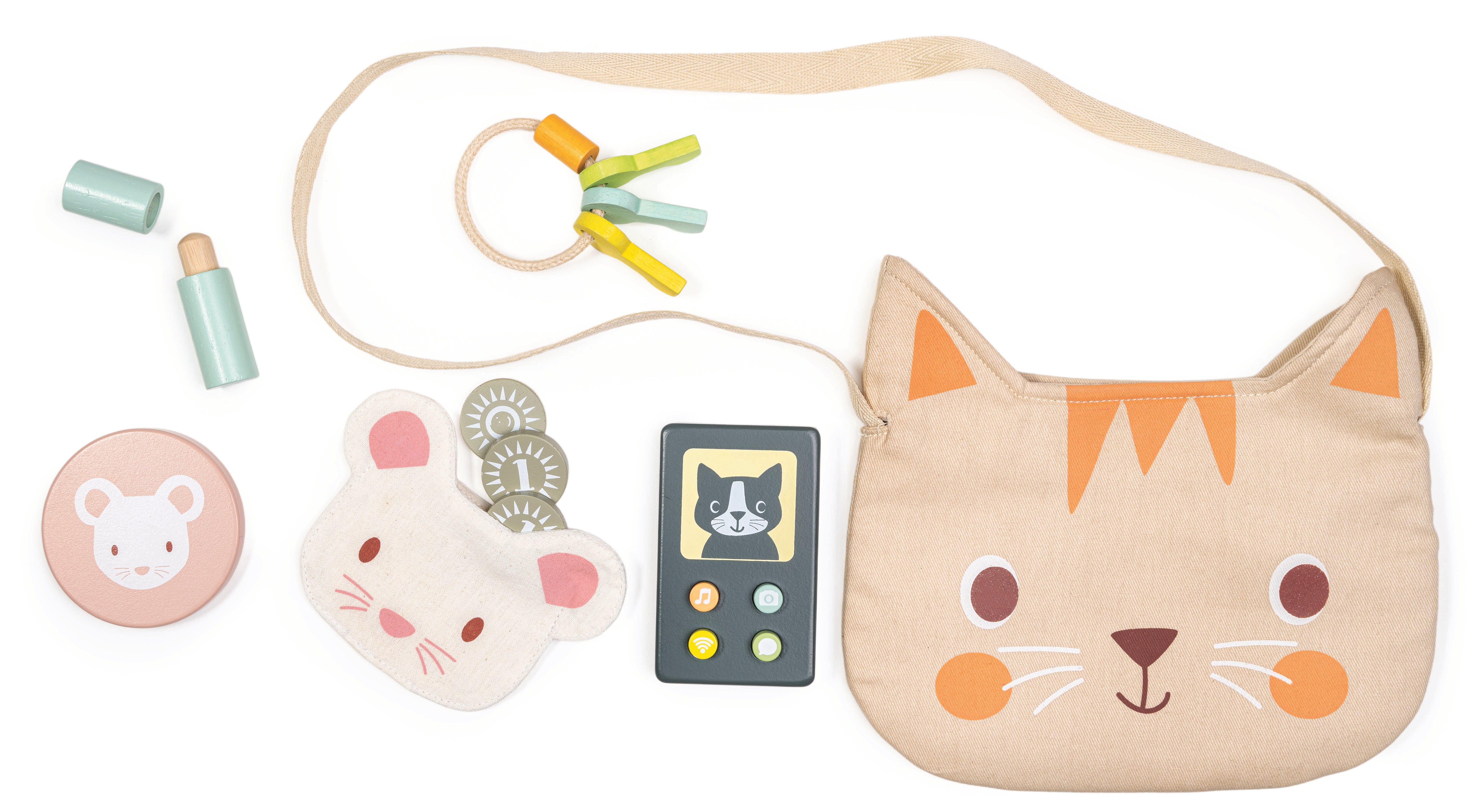 A canvas strap and a velcro fastening keeps everything safe inside; a wooden pretend play mobile phone with colourful push down buttons and a cat face, a set of 3 wooden keys on a ring, a lip balm with removable lid, a mouse purse with 3 wooden coins and a mouse face mirror.